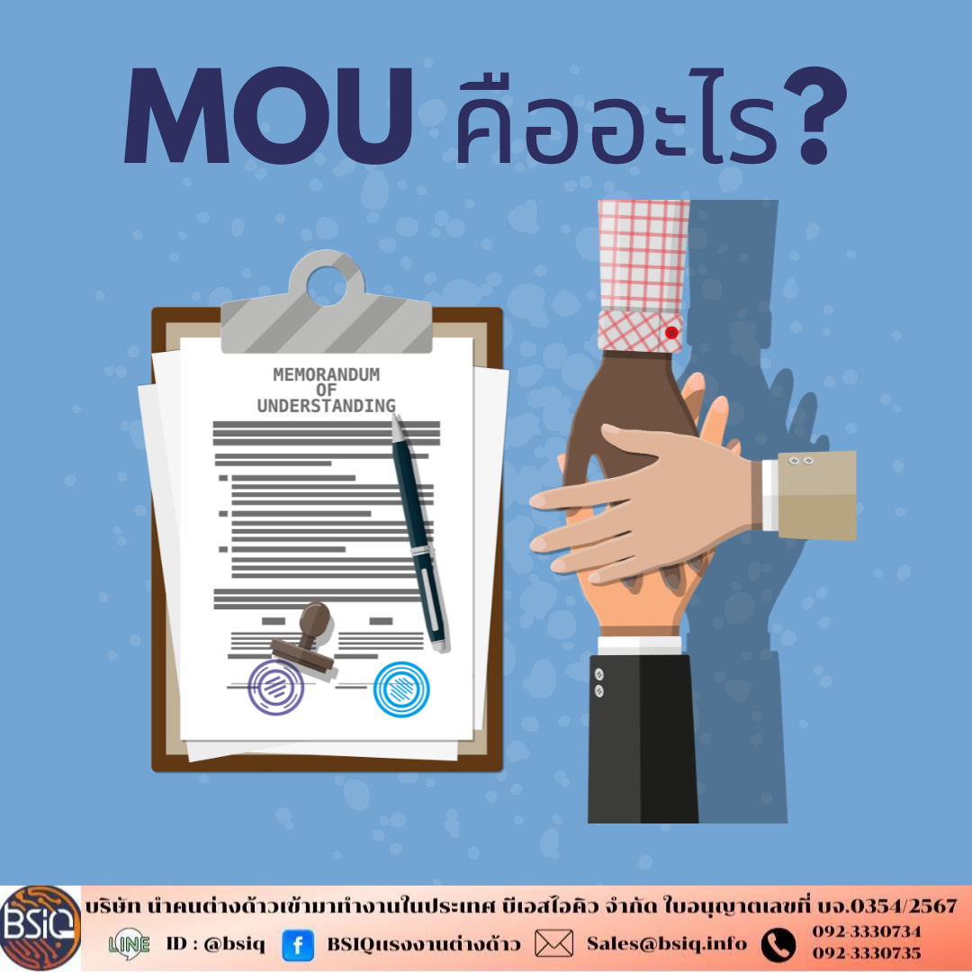Memorandum Of Understanding ( MOU ) คือ เอกสารหรือหนังสือที่มีการเก็บบันทึกข้อตกลงที่มีความเข้าใจตรงกันทั้งสองฝ่าย โดยหน่วยงานของรัฐ บริษัทเอกชน หรือระหว่างรัฐต่อรัฐ เป็นบันทึกข้อตกลงที่มีความเข้าใจตรงกันเป็นรูปเเบบหนังสือหรือสัญญา ซึ่งมีข้อความที่ระบุเป็นหลักเกณฑ์หรือวิธีการให้บุคคลที่เกี่ยวข้องต้องปฏิบัติหรือดำเนินการในเรื่องใดเรื่องหนึ่งเป็นข้อกติกา ข้อที่นัดหมายกันไว้ หรือเงื่อนไขที่กำหนดไว้ โดยที่สัญญาหรือหนังสือนี้ ไม่ถือว่าเป็นสัญญาผูกมัด เเต่เเสดงความต้องการอันเเน่วเเน่ของผู้ลงนามว่าจะปฏิบัติตามที่ได้ระบุไว้เป็น MOU เข้ามา โดยรัฐของประเทศต้นทางได้ทำความเข้าใจที่ตรงกันระหว่างเเต่ละประเทศ โดยตัวเเทนของทุกฝ่าย จะลงนามในบันทึกข้อตกลงสัญญาหรือหนังสือ เพื่อให้มีผลบังคับใช้
