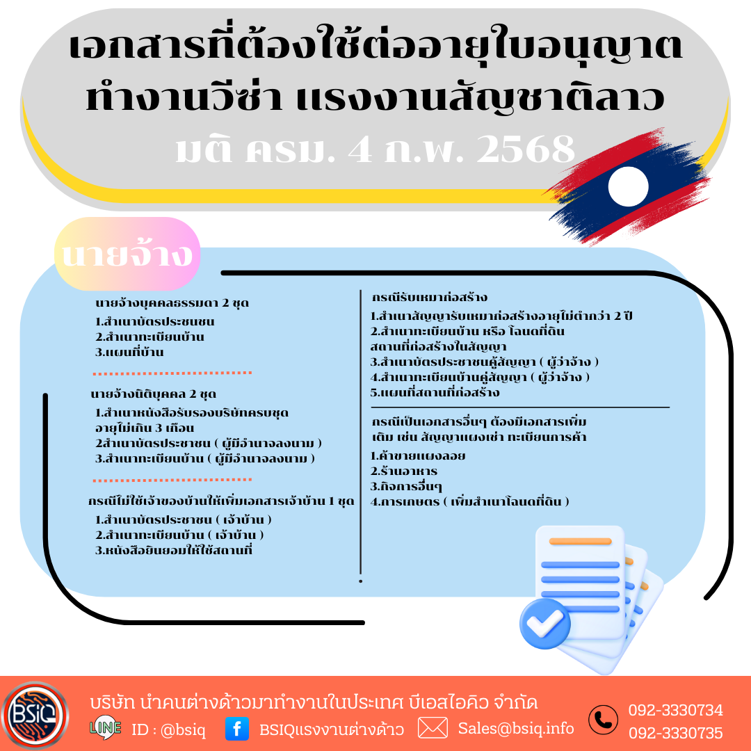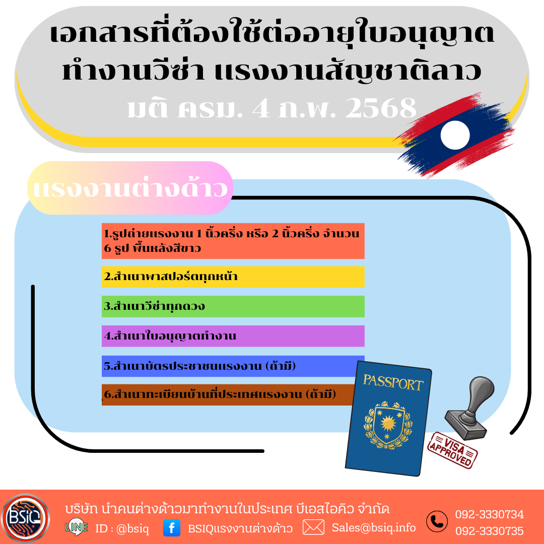 เอกสารที่ต้องใช้ ลาว ต่อใบอนุญาตทำงาน วีซ่า หมด 13 ก.พ. 68 มติ ครม. 4 ก.พ. 68